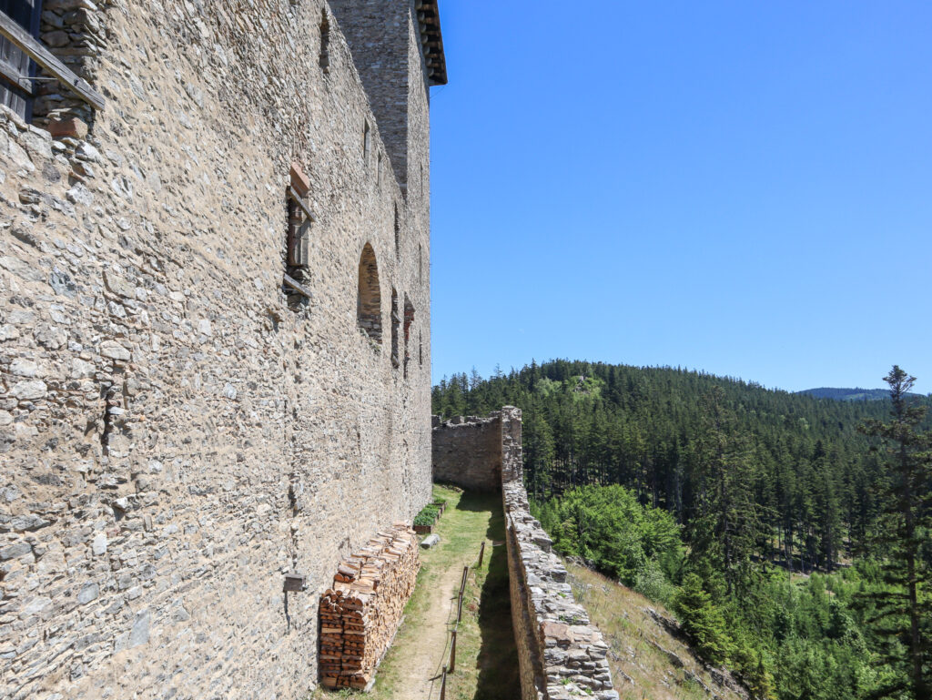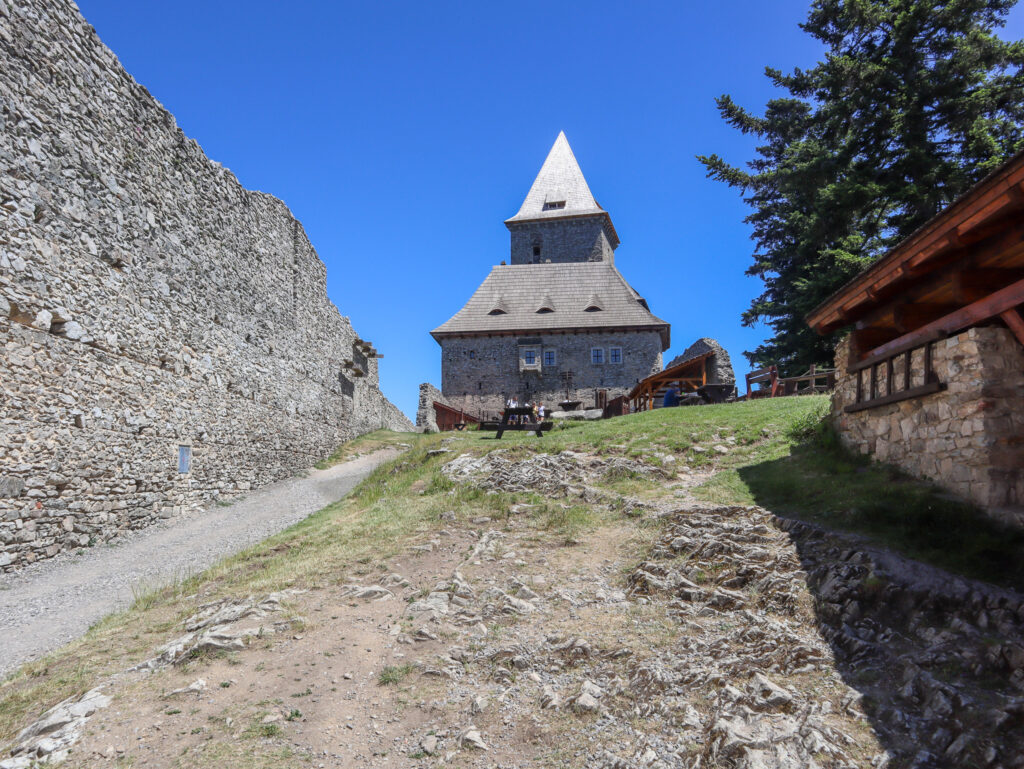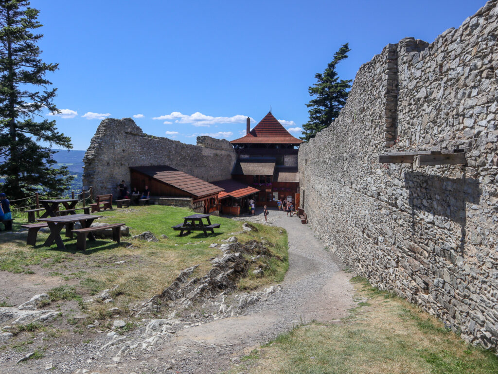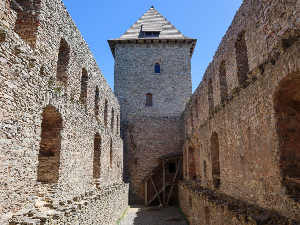 Vstup na nádvoří hradu je zdarma, můžete si tu tedy třeba jen prohlédnout hradby a hlavní průčelí purkrabství a dát si nějaké občerstvení. Byla by ale škoda neužít si i výhledy z věží. Na západní věž se dostanete během komentované prohlídky, kdy se seznámíte s historií hradu, prohlédnete si purkrabství a zříceninu paláce. Během výstupu na věž se vám také předvede působivá audiovizuální projekce, kdy se kolem vás postaví, vybaví nábytkem a následně zanikne středověká komnata. Samotná vyhlídka se nachází v pátém patře věže pod torzem původní středověké střechy. Druhá kratší prohlídková trasa je také s průvodcem, ale není komentovaná a zavede vás rovnou na východní věž. Je tedy ideální, pokud nemáte moc času nebo by třeba děti nebavilo poslouchat historická fakta.