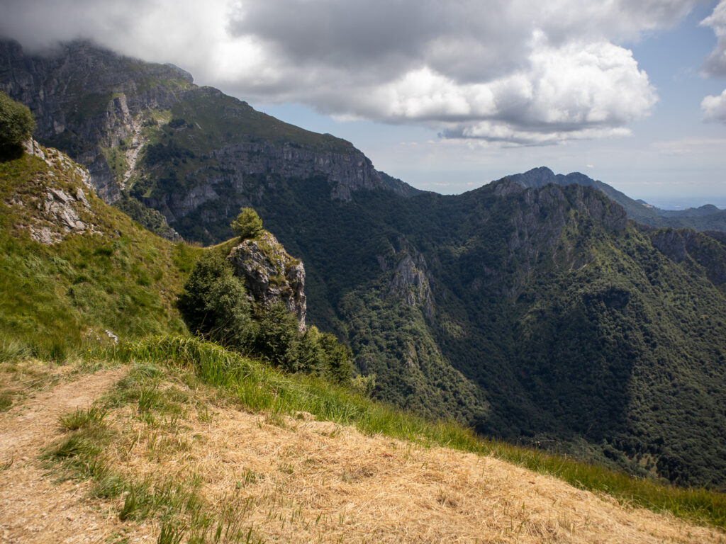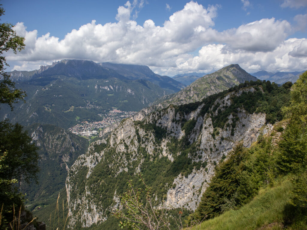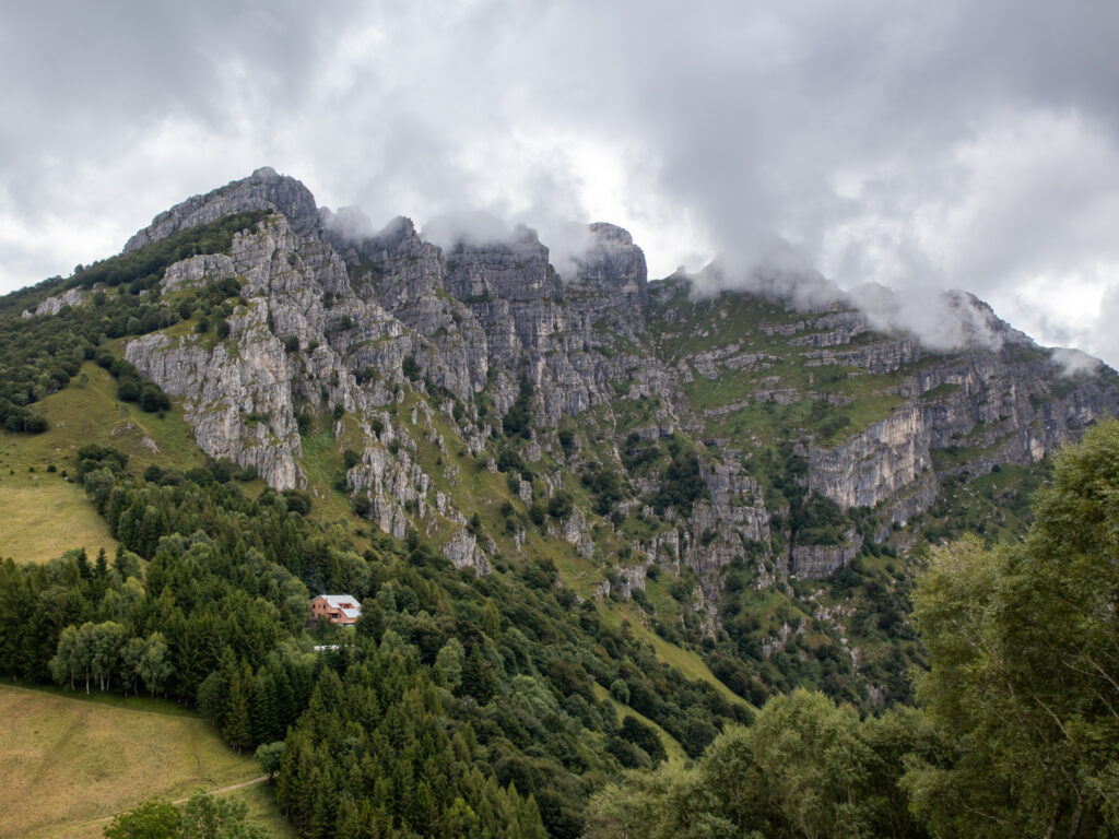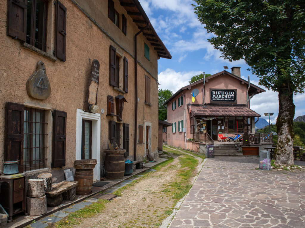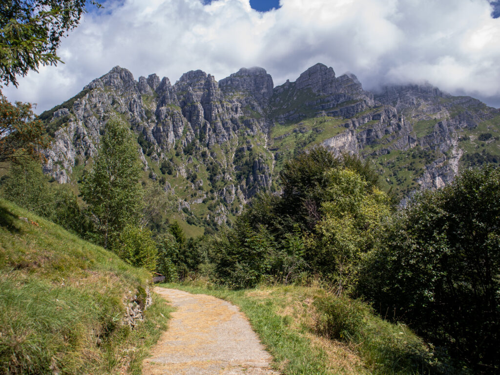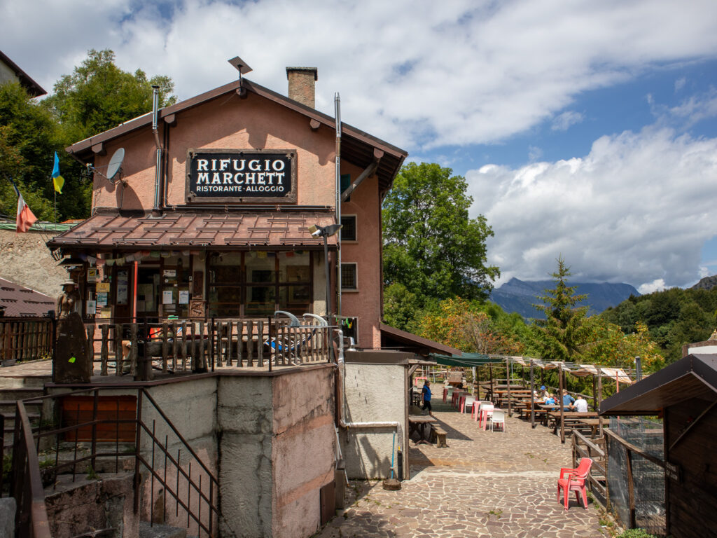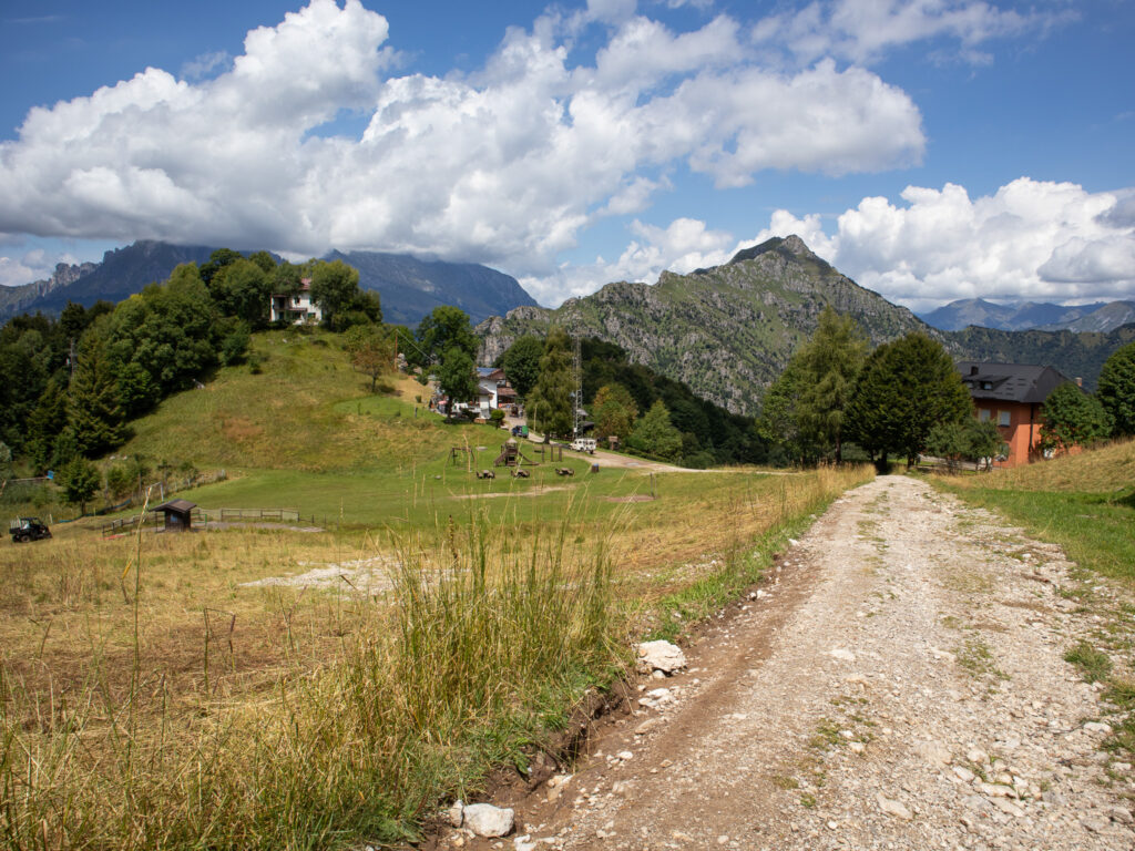 Planinu Piani d’Erna tvoří travnaté horské louky, menší lesy a skalní vyhlídky. Je výchozím bodem pro túry s různou obtížností po okolních horách. Můžete se tu ale vydat i na kratší nenáročné procházky. My jsme nejdřív zamířili přes sedlo Bocca d’Erna do malé osady Vecchio Borgo s chatou Rifugio Marchett, kam je to od lanovky asi 1 kilometr. Nalákalo mě několik fotek chaty s terasou s krásným výhledem, které jsem viděla na Mapy.com, ale pozor, jsou tam vloženy špatně. Rifugio Marchett terasu má, výhled na hory je od ní fajn, ale určitě není jako na mapách.