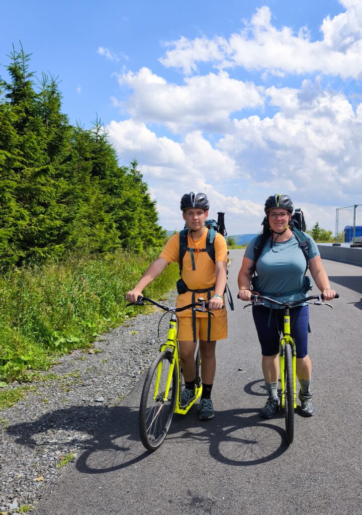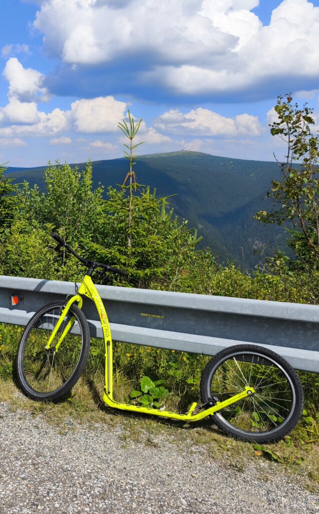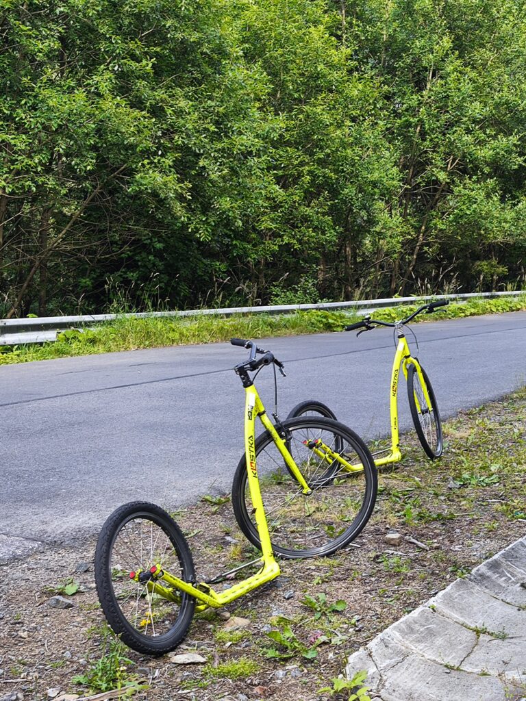 Jestli chcete zažít trochu adrenalinu, můžete si u horní nádrže půjčit koloběžky a sjet na nich dolů do Koutů. Sjezd je dlouhý 17 kilometrů a je nejdelší v Česku. My máme jízdu na koloběžkách rádi, takže jsme si tento zážitek opravdu užili. Koloběžky se půjčují na točně autobusu poblíž občerstvení pod horní nádrží. Půjčení stojí aktuálně 390 Kč (červenec 2025) a platí se za koloběžku, takže i pro děti je to za stejnou cenu (doporučený věk je od 7 let). Sjezd trvá podle vaší rychlosti zhruba půl hodiny až hodinu, na vrácení máte 1,5 hodiny, to je dost času i na zastávky na protažení prstů a nohou nebo focení. A pokud byste náhodou měli defekt, stačí zavolat a přivezou vám novou koloběžku (což jsem v půlce cesty nedobrovolně vyzkoušela). Koloběžky se odevzdávají v areálu Kouty v prodejně Helia sport přímo vedle pokladny na lanovku.