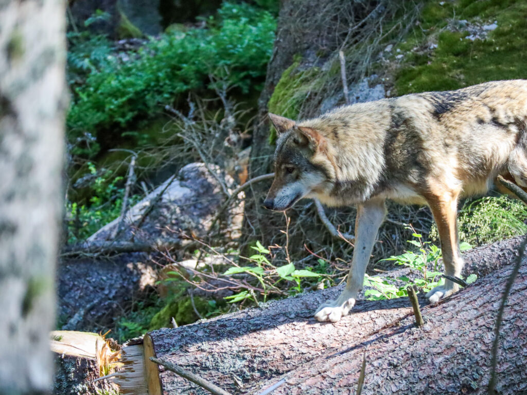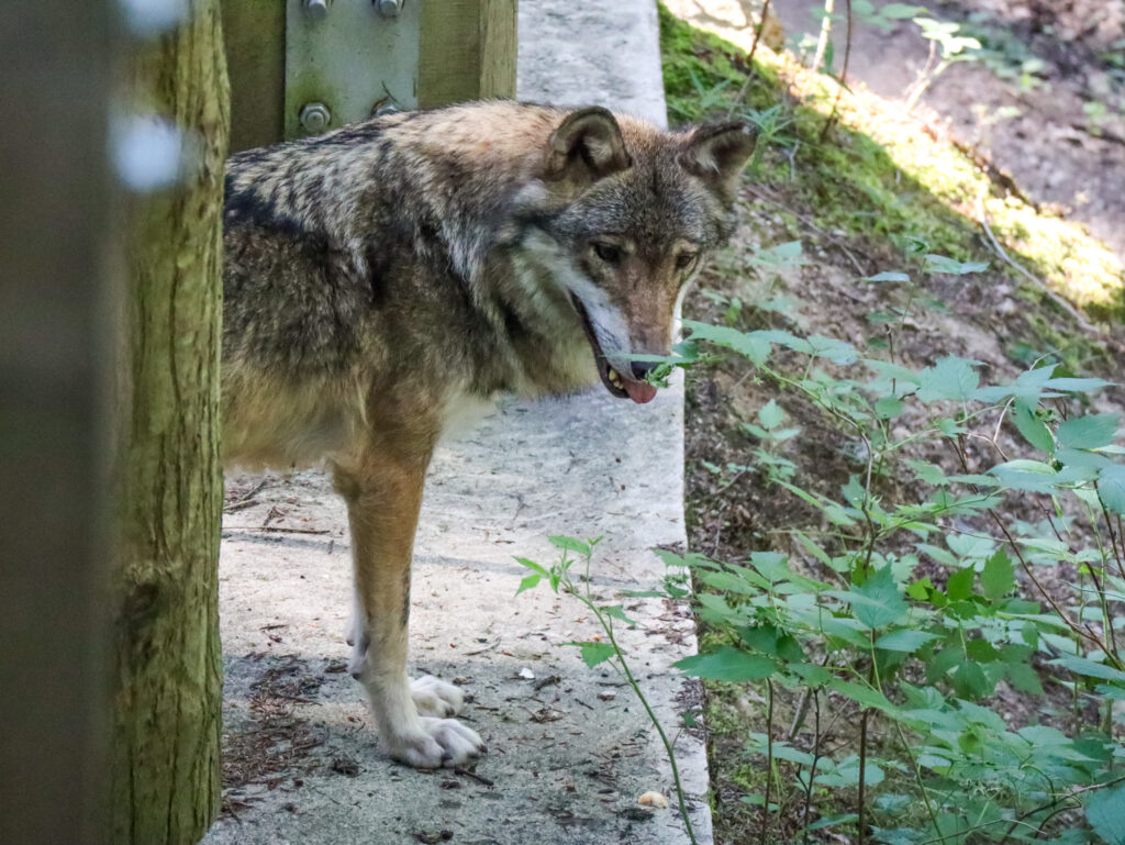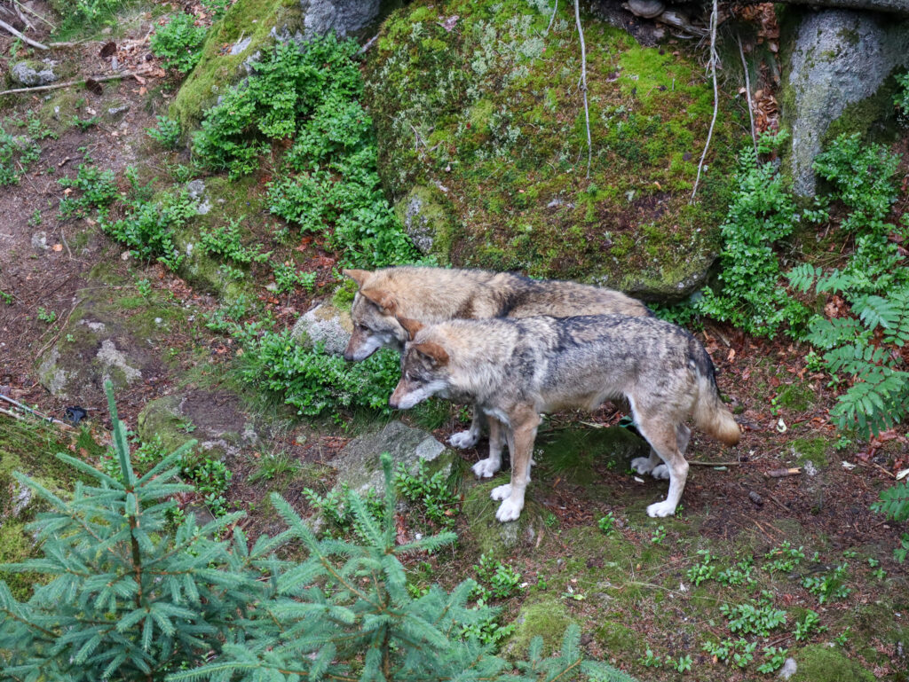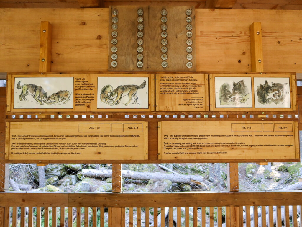 Tím hlavním cílem všech návštěvníků jsou ale samozřejmě samotní vlci, aktuálně tu žije smečka 13 vlků, 7 psů a 6 fen. Výběh o velikosti 3 hektarů je členitý a místy s hustým porostem, takže to chce trpělivost a taky trochu štěstí, aby se vám vlci ukázali v celé kráse. My jsme se tu stavili během týdne na Šumavě dvakrát, pokaždé kolem deváté ráno a zůstali jsme tu zhruba hodinu a půl. Nejvíc se vlci zdržovali v dolní části výběhu, byli z dálky vidět hned na kraji lávky pohledem vpravo dolů. Měli jsme ale štěstí i na bližší kontakt, viděli jsme jednotlivé vlky probíhající výběhem nahoru a dolů i celou smečku v pohybu, to byla opravdu krása pozorovat. A skvělým zážitkem bylo také vlčí vytí. Každopádně je ale fajn vzít si s sebou na pozorování dalekohled, kdyby se vlkům nechtělo blíže k lávce.