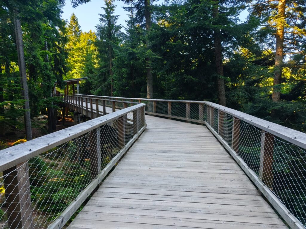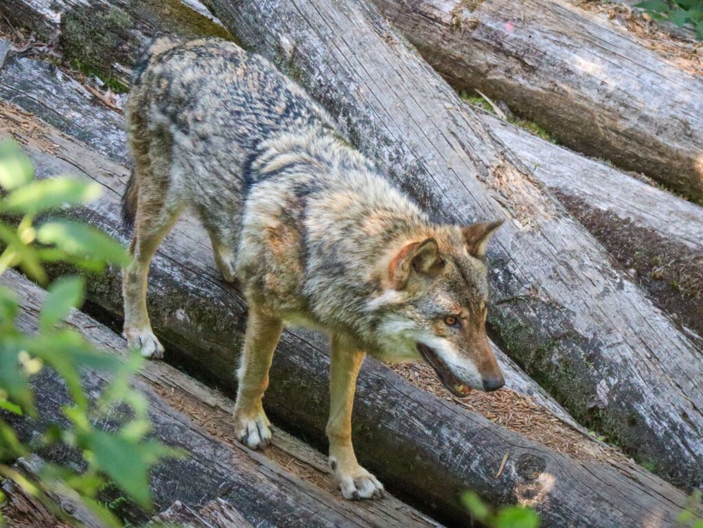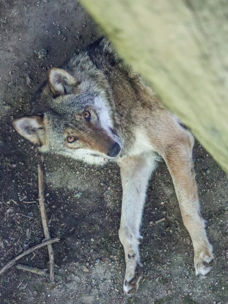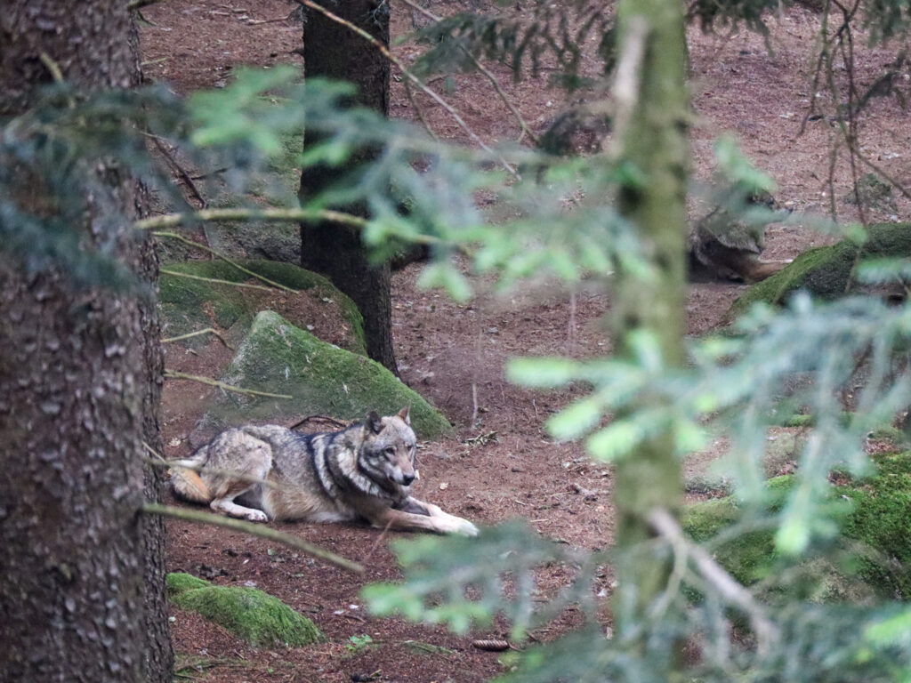 Tím hlavním cílem všech návštěvníků jsou ale samozřejmě samotní vlci, aktuálně tu žije smečka 13 vlků, 7 psů a 6 fen. Výběh o velikosti 3 hektarů je členitý a místy s hustým porostem, takže to chce trpělivost a taky trochu štěstí, aby se vám vlci ukázali v celé kráse. My jsme se tu stavili během týdne na Šumavě dvakrát, pokaždé kolem deváté ráno a zůstali jsme tu zhruba hodinu a půl. Nejvíc se vlci zdržovali v dolní části výběhu, byli z dálky vidět hned na kraji lávky pohledem vpravo dolů. Měli jsme ale štěstí i na bližší kontakt, viděli jsme jednotlivé vlky probíhající výběhem nahoru a dolů i celou smečku v pohybu, to byla opravdu krása pozorovat. A skvělým zážitkem bylo také vlčí vytí. Každopádně je ale fajn vzít si s sebou na pozorování dalekohled, kdyby se vlkům nechtělo blíže k lávce.