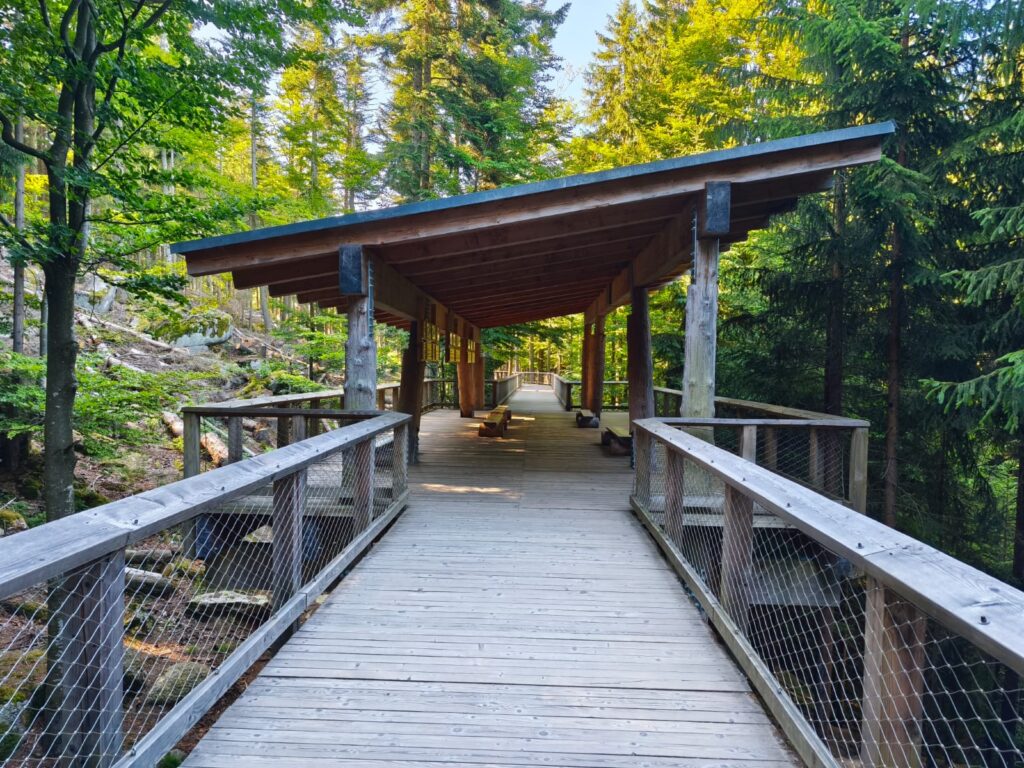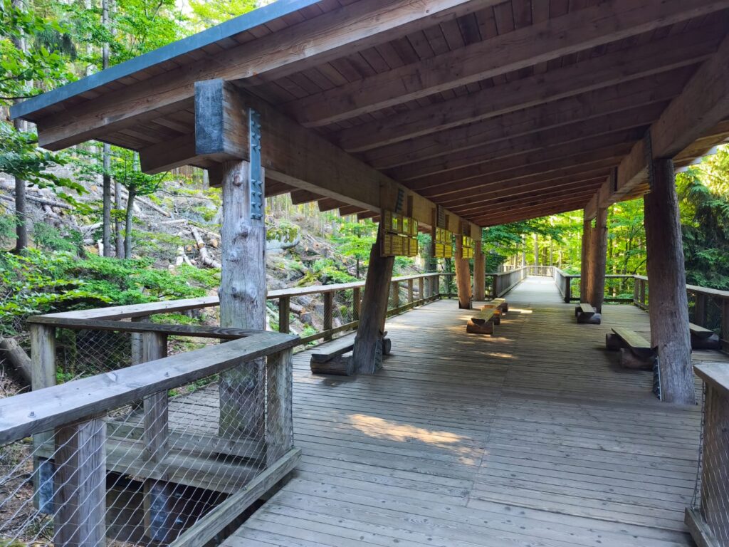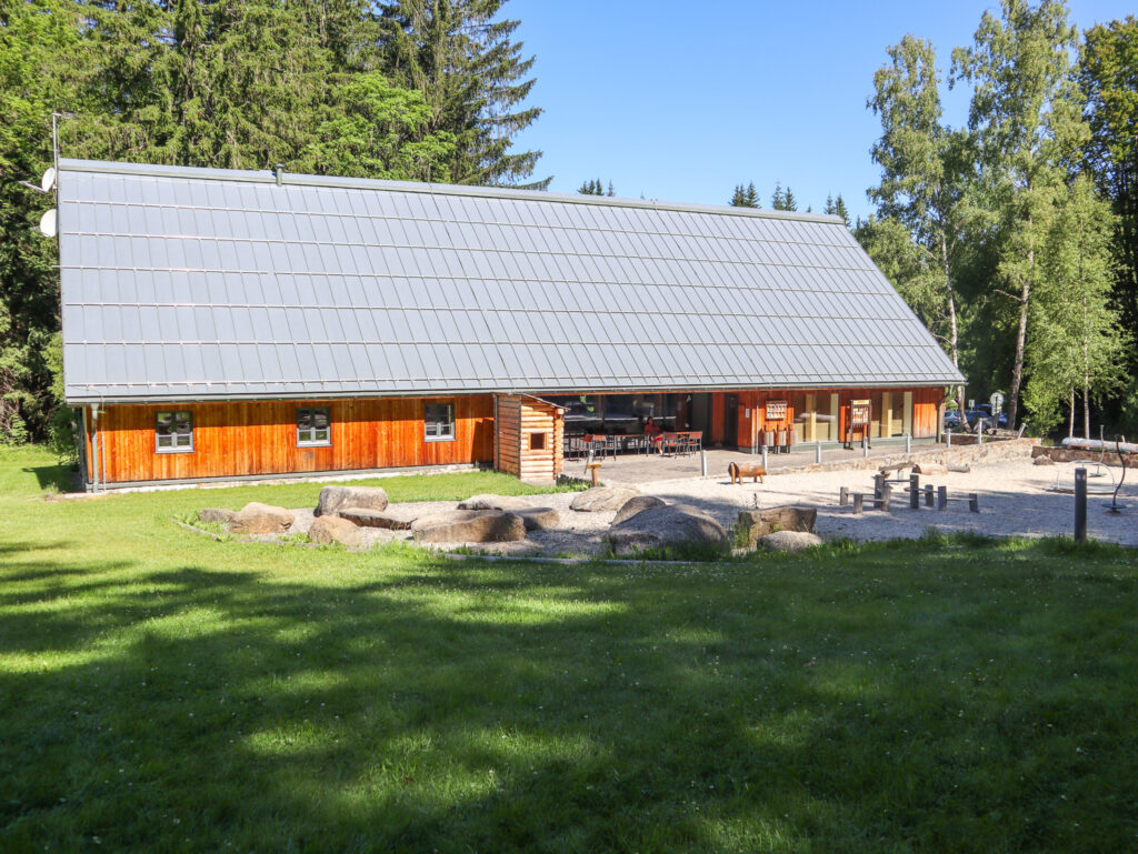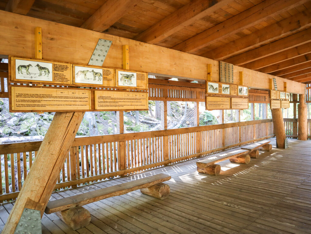 V budově Návštěvnického centra se určitě zastavte, najdete tu velmi zajímavou expozici o životě vlků. Vedle budovy si děti mohou pohrát na hezkém dětském hřišti. K výběhu pak vede 2 kilometry dlouhý naučný okruh lesem, který zhruba v půlce odbočuje na vyhlídkovou dřevěnou lávku vedoucí do samotného výběhu s vlky. Lávka je dlouhá 300 metrů a nad terénem je vyvýšená 3 – 4 metry. Jsou na ní umístěny dva pozorovací přístřešky, kde se můžete posadit na lavičku a přečíst si zajímavé informace o komunikaci ve vlčí smečce.