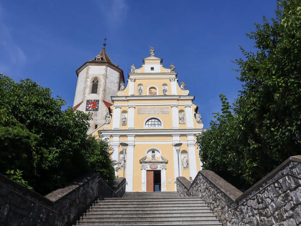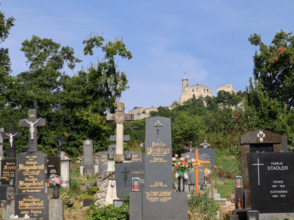 Vydat se na hrad můžete i pěšky z obce Falkenstein, třeba od kostela sv. Jakuba, kam se vyplatí i nahlédnout. Odtud se vydáte po značené stezce, která vás nejprve zavede k romantickému poutnímu místu Mariengrotte ukrytému ve skále. Cesta pak pokračuje lesem a vinicemi směrem k hradnímu kopci.