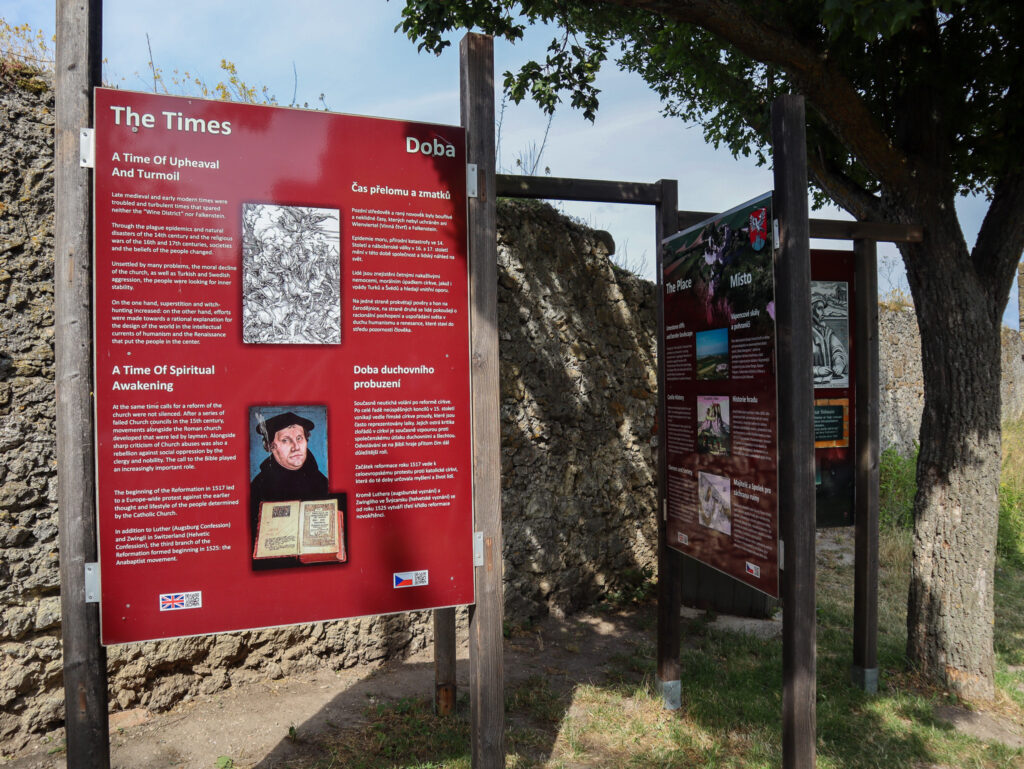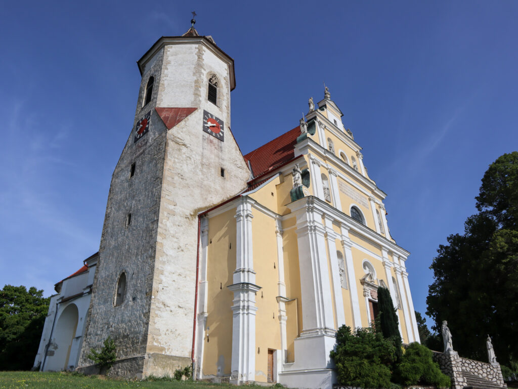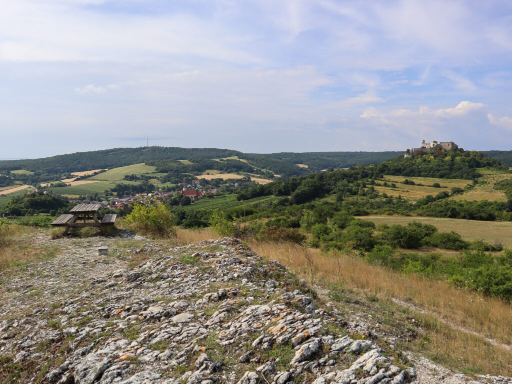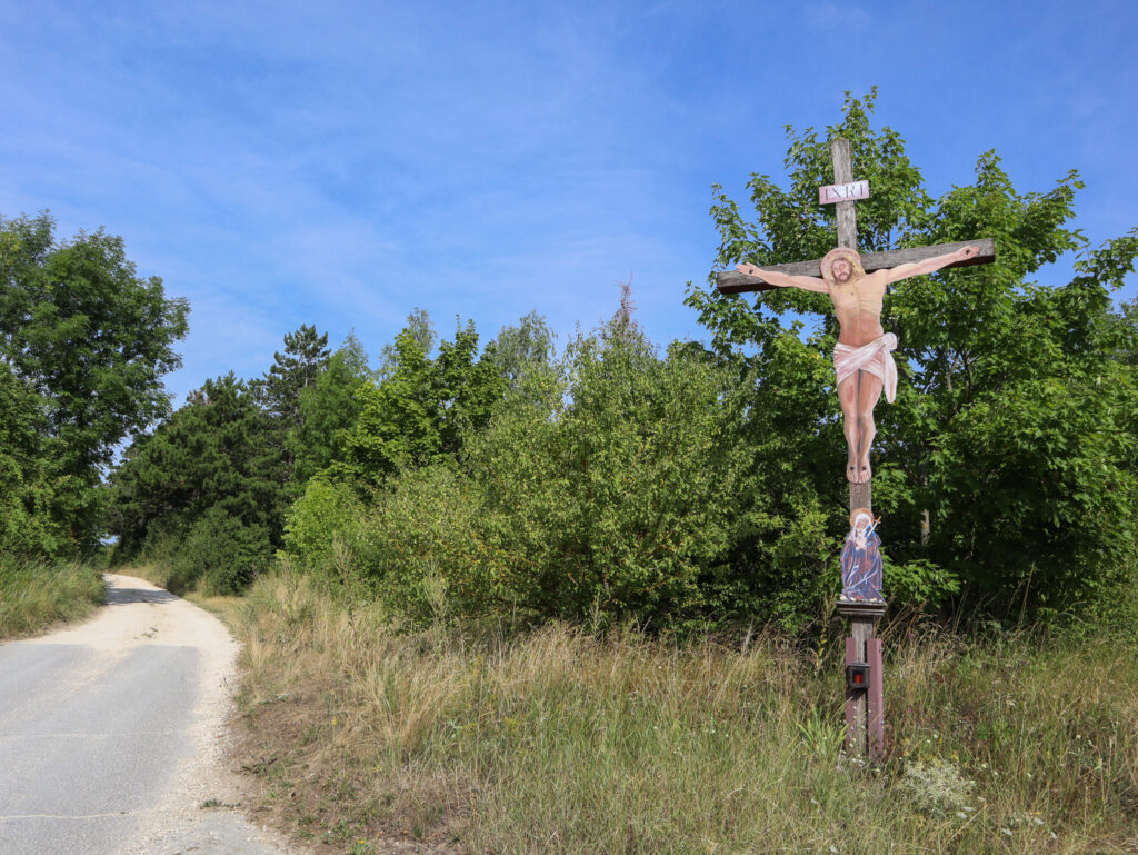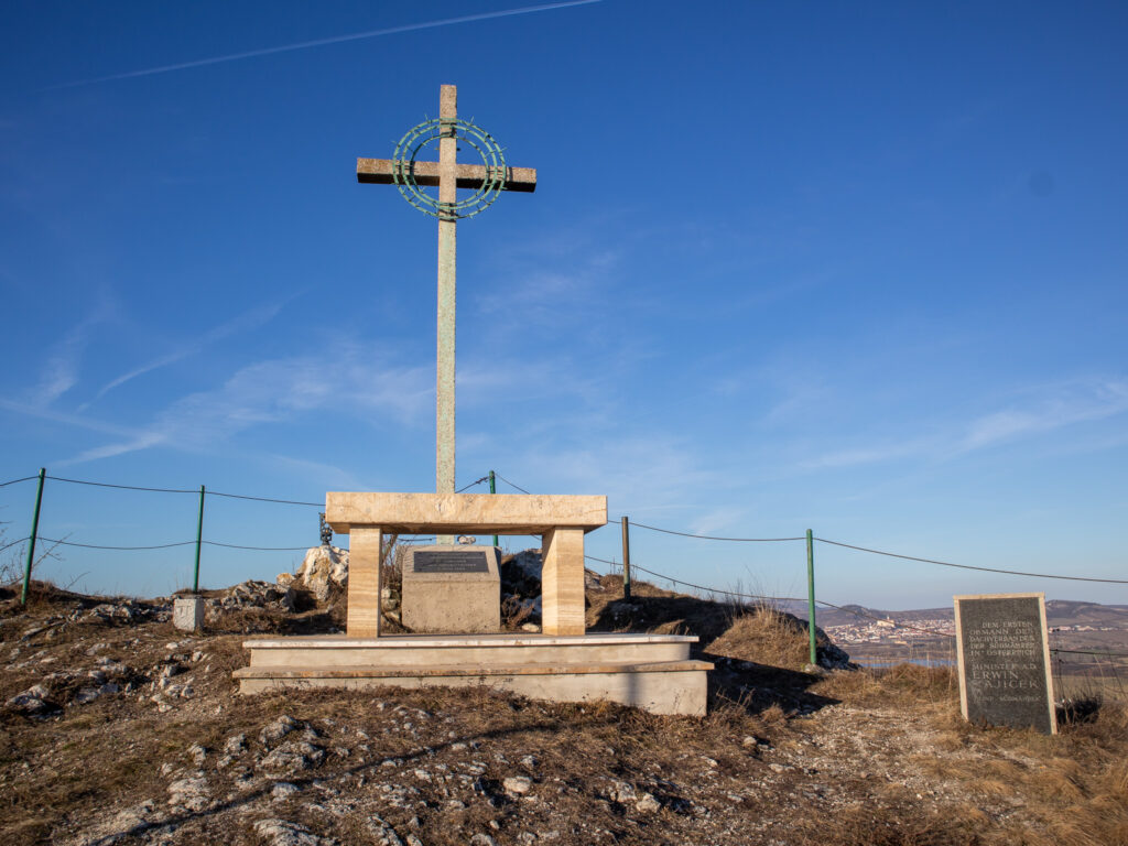 Po cestě od hranic do Falkensteinu pojedete poblíž osamělého kopce Kreuzberg, který se zvedá nad okolní krajinu. Toto místo stojí za zastávku, na vrcholu se nachází památník s vysokým křížem, připomínajícím osud obyvatel pohraničí v minulém století. Nabízí se od něj báječný výhled na sousední Pálavu, Mikulov a Svatý Kopeček a samozřejmě také na Falkenstein.